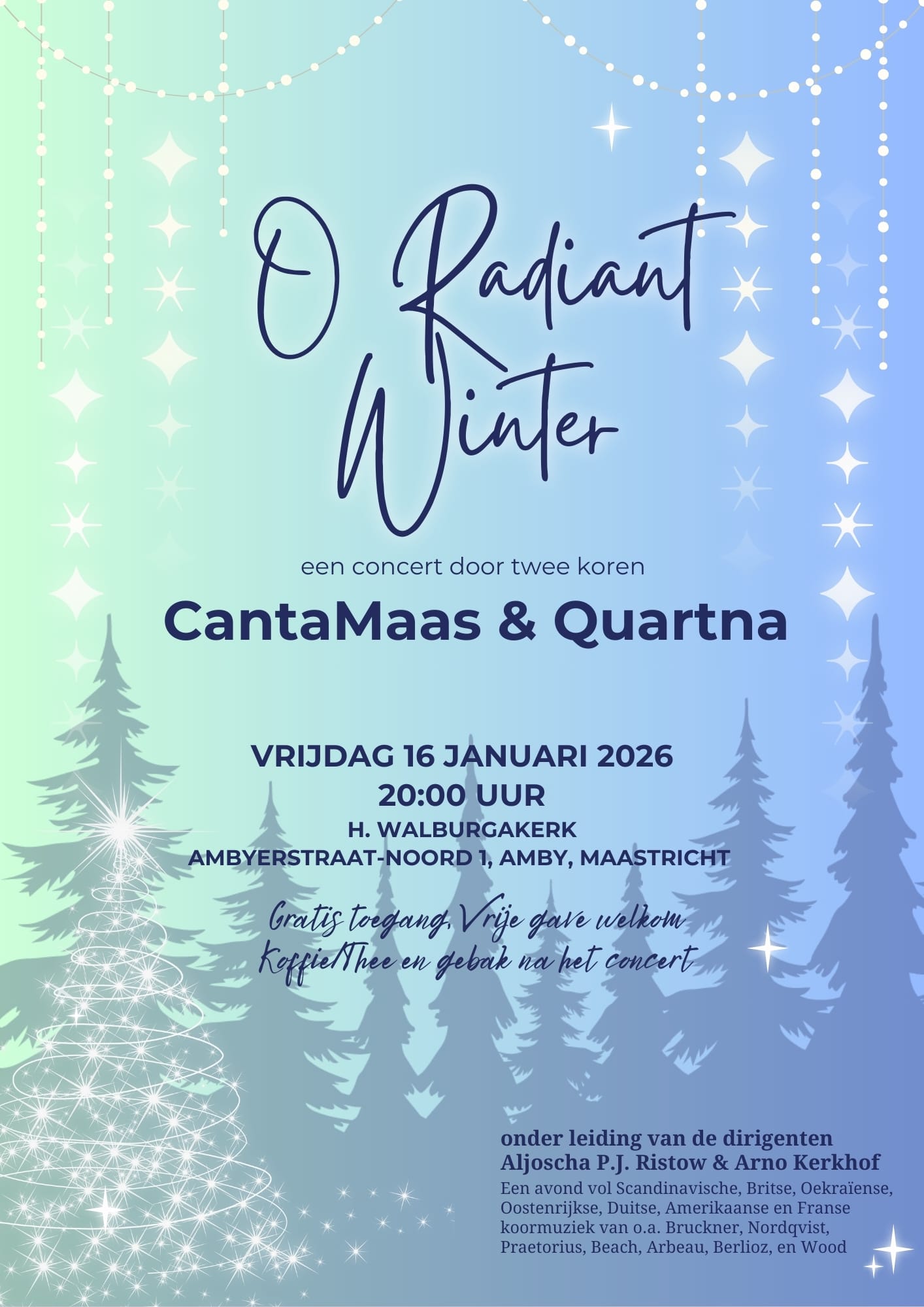 Op vrijdagavond 16 januari 2026 brengen de kamerkoren CantaMaas en Quartna samen een bijzonder winterconcert onder de titel ‘O Radiant Winter’ in de H. Walburgakerk in Amby. Laat u meevoeren door de verstilde schoonheid van de winter, bezongen in koormuziek uit verschillende tijden en tradities. Op het programma staan naast stukken uit verschillende landen werken van diverse componisten – modern en oud – die de winterse sfeer muzikaal tot leven brengen.